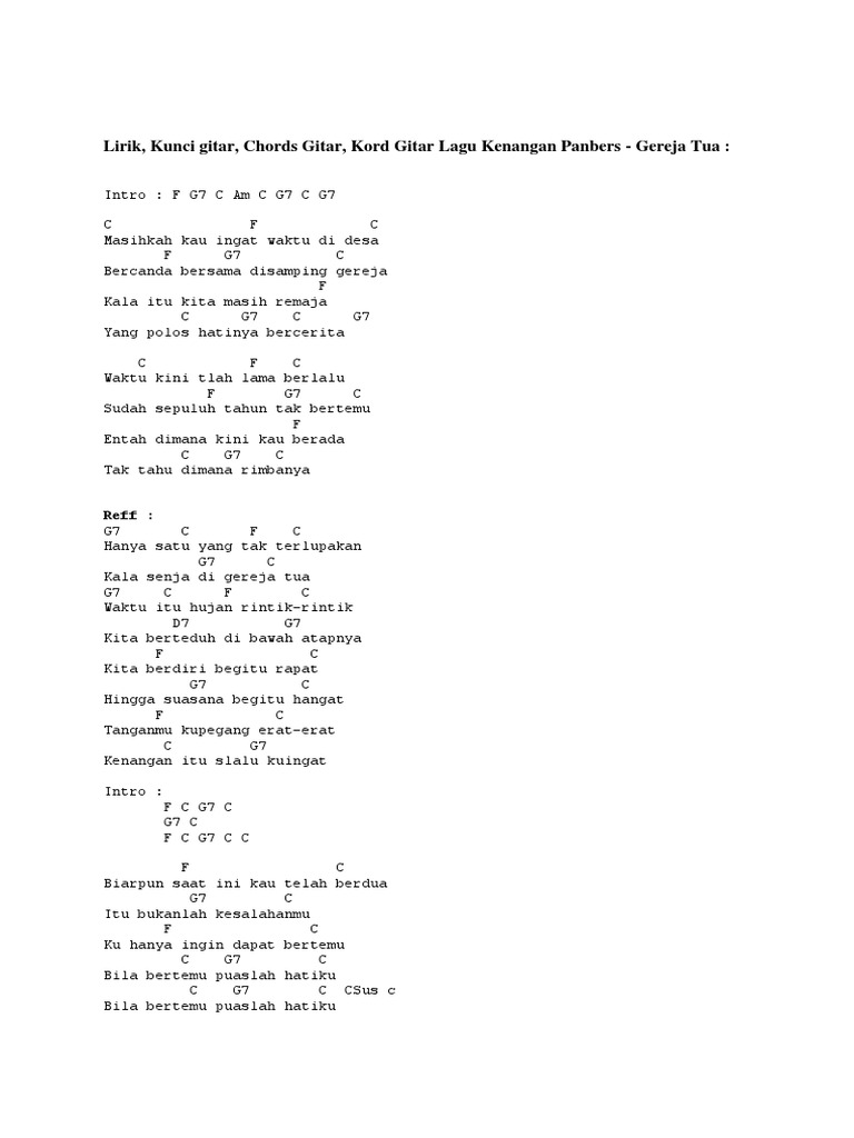 C f c tak kusangka kita dapat bertemu f g c sekian lama kita tak berjumpa c f betapa hatiku sangat bahagia c g c g. C f c masihkah kau ingat waktu di desa f g c bercanda bersama di samping gereja. June 2, 2012 indonesia, kenangan gereja tua, lirik dan chord, panbers leave a comment. Kunci/chord gitar gereja tua panbers dan lirik lagu. Musik chord lirik pada lagu ebiet g ade berita kepada kawan duration.